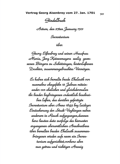 Die Ehe zwischen Georg Aisenbrey und Maria Katzmayer wurde 1689 geschlossen. Im gleichen Jahr wurde auch ein Inventar- und Teilungs-Vertrag aufgesetzt und im Stadtarchiv von Vaihingen aufbewahrt. In der Regel existierte nur die Original-Niederschrift eines Vertrags für Privatpersonen. Im Jahr 1693 wurde Vaihingen bei einem Stadtbrand fast vollständig zerstört, darunter auch das Stadtarchiv mit all seinen wertvollen, unersetzbaren Dokumenten. Im Jahr 1701 wurden deshalb die Eheleute Georg und Maria Aisenbrey durch "oberamtliches Anschreiben" aufgefordert, aufs newe ein Inventarium zu erstellen.