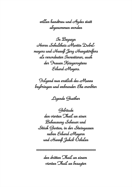 ... des Manns beybringen und wehrender Ehe ererbter ...: die Ehe war auch damals schon eine Zugewinn-Gemeinschaft. An die Nachkommen vererbt wurde das gesamte in die Ehe eingebrachte und während der Ehe hinzugewonnene Vermögen.