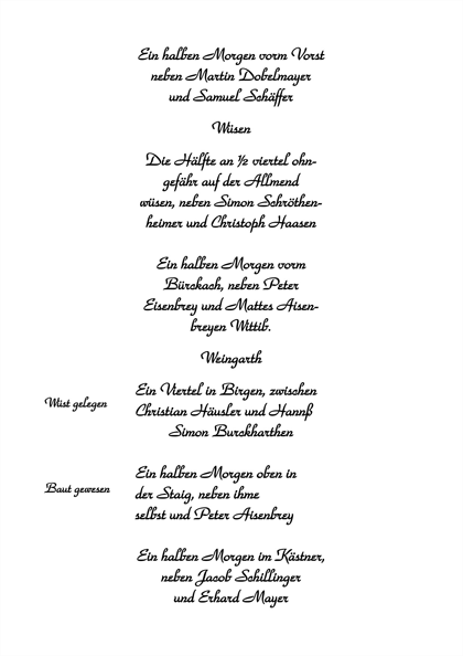 Ein halben morgen vorm Bürckach, neben Peter Eisenbrey und Mattes Aisenbreyen Wittib: wo sich das Gewann Bürckach befand, war bisher nicht zu ermitteln. Aufschlußreich ist jedoch die Lagebeschreibung der Wiese: "Peter Eisenbrey" ist wohl Georg's Bruder, und "Mattes Aisenbreyen Wittib" wird wohl seine Tante Barbara gewesen sein, denn sein jüngster Bruder Matthäus war schon 1694 gestorben. Da die drei Wiesen nebeneinander lagen, könnten sie vorher Georg's Vater Matthäus (1. Generation) gehört haben, der 1691 nach seiner Ehefrau Maria starb und so die Wiese an seine drei Söhne vererben konnte.