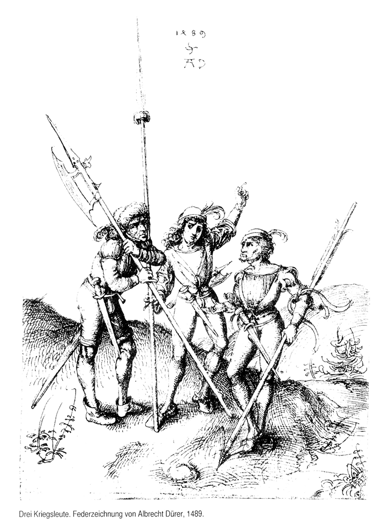 Fig. 3 Three warriors with halberd and longspear. Pen-and-ink drawing by Albrecht Dürer